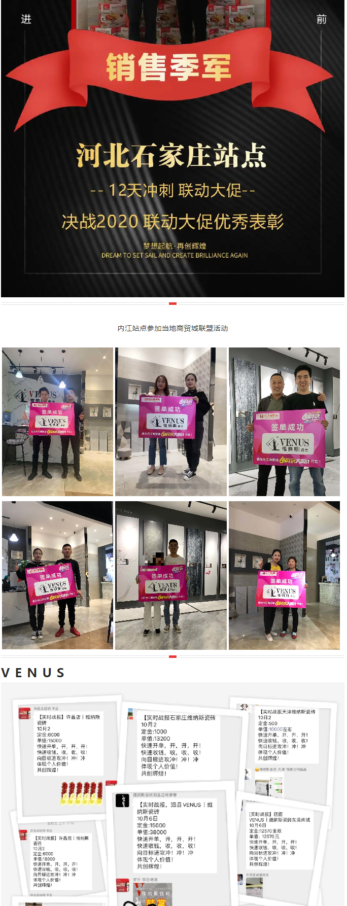 2020年9月26日至10月7日,维纳斯瓷砖开启了“大国崛起.大牌献礼-维纳斯瓷砖放价不放假”为主题的全国联动,由总部策划、统筹,携手全国部分经销商家人共同执行。历时12天,288个小时的全国联动,以出色的成绩完美收官!活动期间,全国各地经销商捷报频频,业绩更是一次又一次地再创新高!