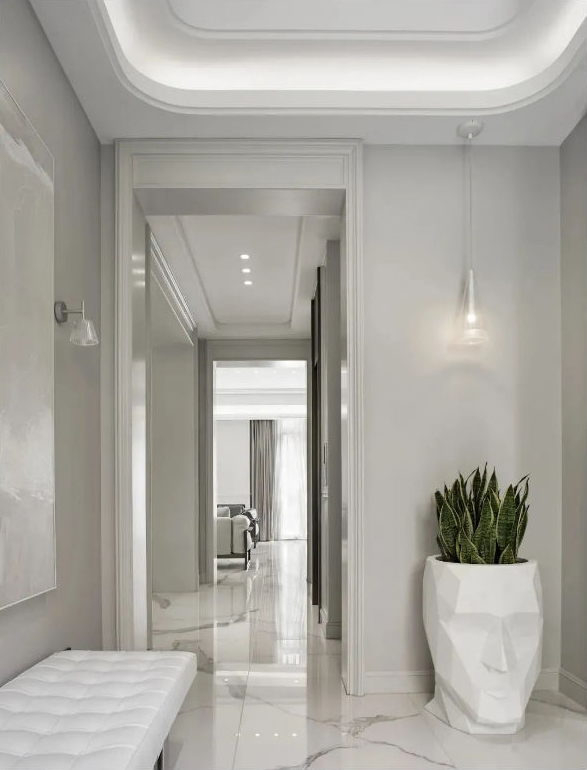 设计师以意大利卡拉拉白大理石通铺地面作为整个纯净空间的开场。一幅不同灰度组合的写意画作安放在换鞋凳上方,搭配FLOS壁灯,意境悠远。西班牙Vondon Adan经典菱形人脸造型落地花盆,让人在此转换心情,等待迎接家的温馨。